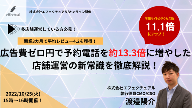 Googleビジネスプロフィールを活用した店舗の集客支援サービスを行う株式会社エフェクチュアル(本社:東京都港区、代表取締役:田中倫明)は、10月25日(火)に「広告費ゼロ円で予約電話を約13.3倍に増やした店舗運営の新常識を徹底解説!」と題し、無料ウェビナーを開催いたします。