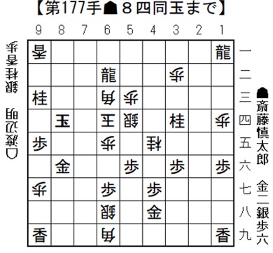 ▲8八玉 △3一玉 ▲6八金 △8六歩 ▲同 歩 △8一飛 ▲7八玉 △8五歩 ▲同 歩 △同 桂 ▲8八銀 △8六歩 ▲6四角 △7五歩 ▲8三歩 △同 飛 ▲9一角成 △7六歩 ▲9二馬 △8四飛 ▲9三馬 △8一飛 ▲8二歩 △7一飛 ▲8一歩成 △同 飛 ▲8三歩 △9七歩 ▲6九玉 △9六角 ▲5九玉 △8七歩成 ▲8二歩成 △6一飛 ▲7一と △4一飛 ▲8四馬 △6三金 ▲8七銀 △同角成 ▲8五馬 △7一飛 ▲4五桂 △7七歩成 ▲同 桂 △7六歩 ▲3三桂成 △同 桂 ▲7二歩 △同 飛 ▲7三歩 △8二飛 ▲8四香 △4二飛 ▲7八銀 △同 馬 ▲同 金 △7七歩成 ▲同 金 △4四桂 ▲4六桂 △7六歩 ▲同 金 △5六桂 ▲同 歩 △4五桂 ▲6八玉 △6四桂 ▲3四桂 △4四飛 ▲2四歩 △同 歩 ▲同 飛 △3三銀 ▲2二角 △4一玉 ▲3三角成 △7六桂 ▲同 馬 △3三金 ▲4二銀 △同 飛 ▲同桂成 △同 玉 ▲2二飛成 △3二歩 ▲1一龍 △5七銀 ▲7八玉 △6九角 ▲7七玉 △6八銀不成▲8六玉 △4一歩 ▲2一飛 △5一金 ▲3五香 △3四桂 ▲同 香 △同 金 ▲4六桂 △8五歩 ▲同 玉 △7四銀 ▲9四玉 △9一香 ▲9三桂 △5二玉 ▲3四桂 △7三金 ▲4一飛成 △6三玉 ▲7五桂 △6四玉 ▲5一龍 △8五銀打 ▲同 馬 △同 銀 ▲同 玉 △9六角打 ▲9四玉 △7五玉 ▲6四銀 △同 玉 ▲6二龍 △6三角 ▲8六金 △8四金 ▲同 玉 まで177手で先手の勝ち