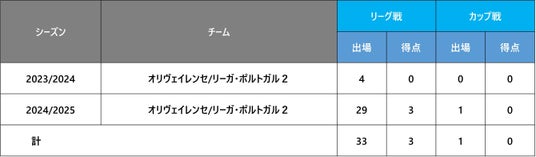 2023年12月18日のリーガ・ポルトガル2 CDマフラ戦でプロデビューを飾りました。2024/2025シーズンもオリヴェイレンセでプレーをし、2024年12月30日のマリティモ戦にて19歳でプロ初ゴールを記録。