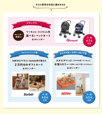 ご応募いただいた写真は、本キャンペーンサイト上に掲載され、投稿された「うちの子」を確認できるとともに、オリジナル待ち受け画像をダウンロードすることができます。*¹優秀作品は、アイペット公式カレンダーでモデルとして採用されるほか、最優秀作品には「グランプリ」としてカレンダーの表紙を飾っていただきます。また、季節に合った写真映えする作品からは「フォトジェニック賞」、 寝顔が素敵なワンちゃんの作品からは「すやすや賞」、遊ぶ・走る・ジャンプするなど、エネルギッシュなネコちゃんの作品からは「元気いっぱいで賞」を選考し、豪華賞品を進呈します。このほか、投稿数の多かった上位20名様*²には便利なペットグッズが当たる「うちの子マニアで賞」を、 惜しくも入賞を逃した方にも、抽選で20名様に賞品が当たる「ラッキーで賞」をご用意しております。たくさんのご投稿をお待ちしております。