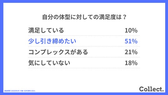 自分の体型に対する満足度は、過半数が「少し引き締めたい(51%)」と答えました。加齢による体型変化や体力の衰えを実感しやすい50代は、現状を維持・改善したいという意欲が強いようです。