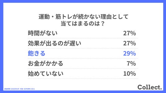 「飽きる(29%)」を筆頭に、「効果が出るのが遅い(27%)」「時間がない(27%)」がほぼ同率で続きました。モチベーション維持や運動時間の確保を難しいと感じている人が多いようです。