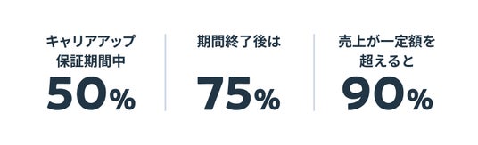 キャリアアップ保証期間中のコミッション(歩合)は50%、その後は75~90%で、少ない案件数でもしっかり報酬につながります。