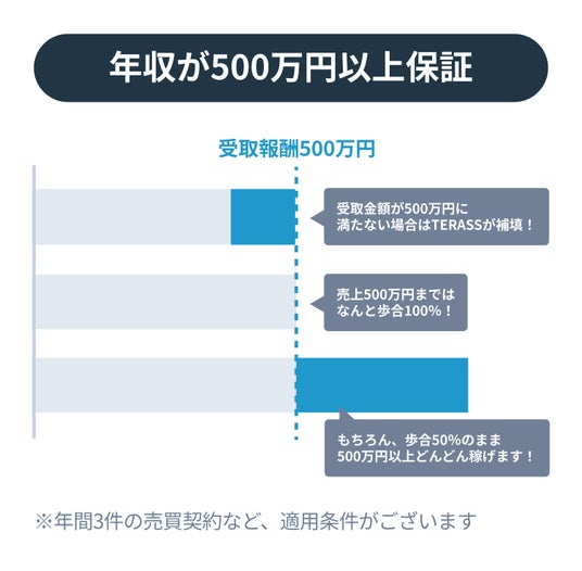 不動産仲介関連サービスを提供する株式会社 TERASS(東京都港区、代表取締役:江口亮介、以下「TERASS」)は、個人で不動産仲介を行う不動産エージェント(以下「エージェント」)としてTERASSに新規参画し、一定条件を満たした場合に、年収500万円以上を保証する「キャリアアップ保証」を開始いたしますので、お知らせいたします。