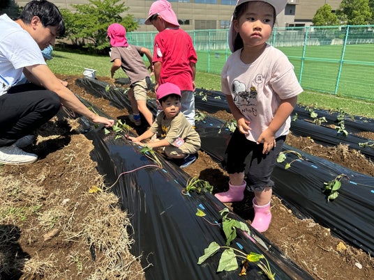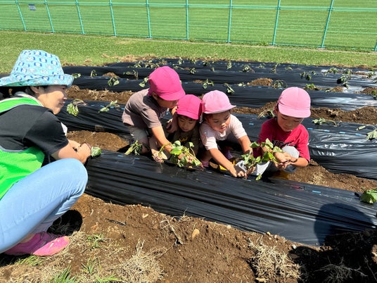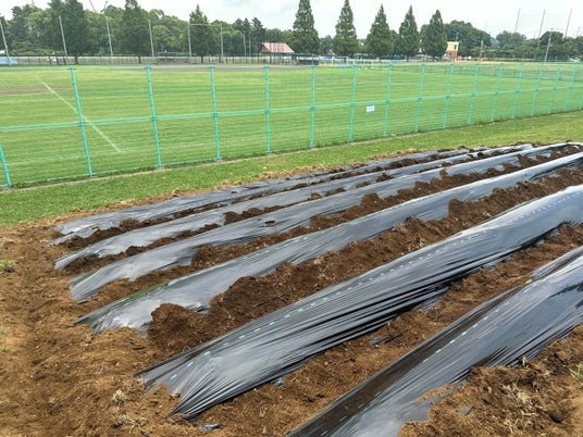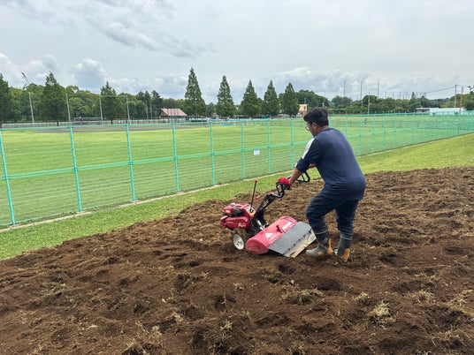 等々力緑地内の軟式野球場に隣接する芝の生えた斜面を耕すところから公式畑作りは始まりました。重機を入れて土を掘り起こし、さらに耕して、サツマイモが植えられる場所を作りました。せっかくの挑戦なので、難易度の高い「無農薬・有機栽培」で行うことを決め、施したのは堆肥のみ。苗は日本さつまいもサミット初代受賞者の深作農園様に提供いただき、べにはるかを200株用意。食育、そして地域貢献の観点から、植え付けには地元川崎市中原区の中原保育園の園児の皆様に協力いただき、実施しました。