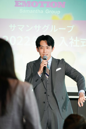 渡辺美優紀さんや高橋メアリージュンさん、ryuchellさんなどからのお祝いムービー、サマンサ女子によるダンスの披露、プロモーショナルモデルを務める杉野遥亮さんのサプライズ登場、先輩社会人である杉野さんと新入社員とのQ&Aコーナー、最後には杉野さんと新入社員の集合写真撮影にて、3年ぶりのオフライン開催となる2022年度入社式を華やかに締めくくりました。