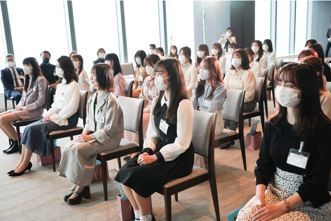 会場では、2020年度の入社式でもオンラインで登場し、プロモーショナルモデルを務める杉野遥亮さんからのビデオメッセージも流されました。