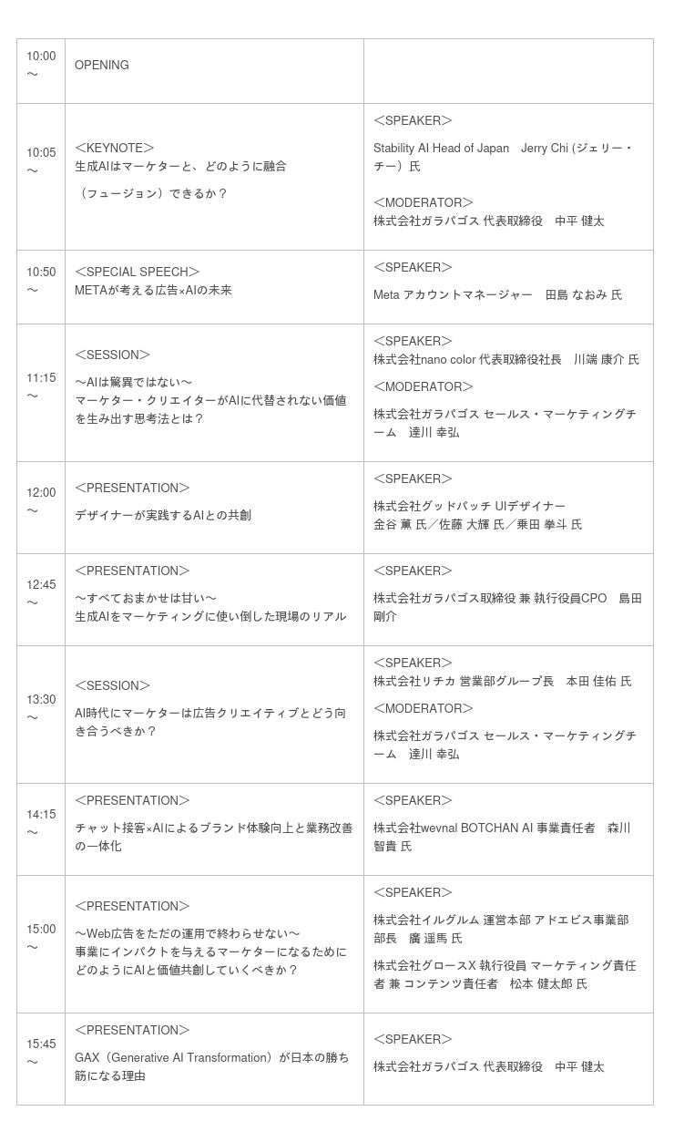 AIを活用し、事業成長につながるWeb広告のすべてをサポートするWeb広告支援サービス「AIR Design(エアデザイン)」を展開する株式会社ガラパゴスは、7月12日(水) に、日本初*の生成AIとマーケティングをテーマとしたカンファレンス「Ad Creative Summit 2023 summer by AIR Design ~GAX(Generative AI Transformation)時代の広告クリエイティブ最前線~」を開催します。