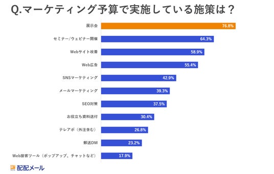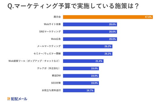 マーケティング予算の使い道として最も多かったのが「展示会(47.6%)」で、費用対効果の高い施策としても最多の回答を獲得