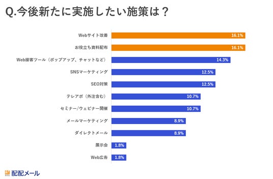 今後新たに実施したい施策としては、「Webサイト改善」「お役立ち資料配布」と回答した企業が16.1%と同率で上位を獲得。