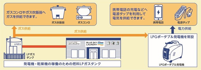 災害対応型ランドリーは「標準仕様」として3日分のLPガスを貯槽できるLPガスタンク、ポータブル発電機への接続が可能な設備を完備します。ポータブル発電機はガスを利用して発電する仕組みになっており、携帯電話充電などへ電力供給することが可能です。また、店舗にガスコンロ、ガス炊飯器を導入し、被災者向けの炊き出しが可能になります。昨今の社会情勢により三密回避に向けた分散避難が必要となる中、コインランドリーを“臨時避難所“として活用する事ができます。