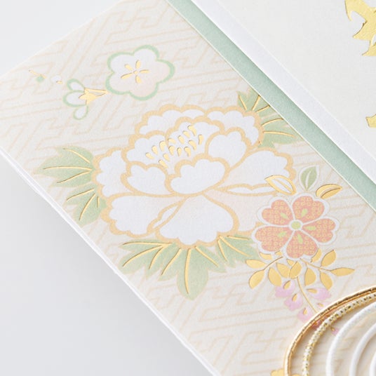 『しらら金封』は、白無垢をイメージしてデザインされた婚礼用祝儀袋です。白を基調に金とパールの2色で箔押し加工を施すことで、上品な華やかさを表現しました。デザインは「白」と「桃」の2種です。「らくタッチ」構造を採用しており、水引飾りを外すことなく、中袋の出し入れが簡単に行えます。