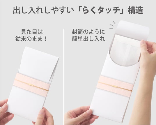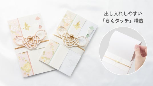 そしてこの度、「らくタッチ」構造を採用した祝儀袋の第1弾として、『しらら金封』を2025年9月29日(月)に新発売します。今後は「らくタッチ」構造の祝儀袋を広く展開し、祝儀袋の使用にハードルを感じていた人や、使い慣れない若い世代の人にも、より気軽で快適に使える製品を提供していきたいと考えます。