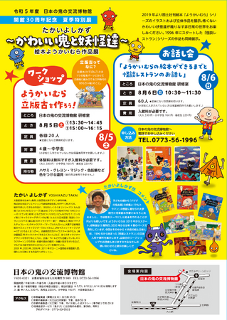 たかいよしかずさんはボローニャ国際絵本原画展で入選した『おはなしくろくま』シリーズなど数々の代表作を持つ絵本作家で、本展では、たかいさんの描く絵本『ようかいむら』や『怪談レストラン』のかわいい鬼や妖怪のイラストや立体人形を展示します。子どものころから妖怪や怪獣に魅せられて「今、妖怪をテーマにした絵本を作れることが何より嬉しいです」と語るたかいさんの作品世界が、夏休みに、鬼の博物館に広がります。