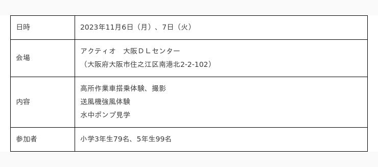総合建設機械レンタルの株式会社アクティオ(本社:東京都中央区日本橋、代表取締役社長兼COO:小沼直人、以下アクティオ)は、2023年11月6日(月)~7日(火)にアクティオ大阪DLセンターにおいて、大阪市立南港桜小学校の小学3年生と5年生を対象に見学会を実施しました。
