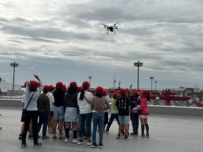 見学会当日は、大阪DLセンターの説明に加え、送風機による強風体験や水中ポンプ見学、高所作業車に乗り高い位置に上がったところで頭上へドローンを飛ばし記念撮影会を行うなど、楽しみながら建設機械について学んでもらうことができました。子どもたちは初めて触れる建設機械に興味津々の様子で充実した見学会となりました。