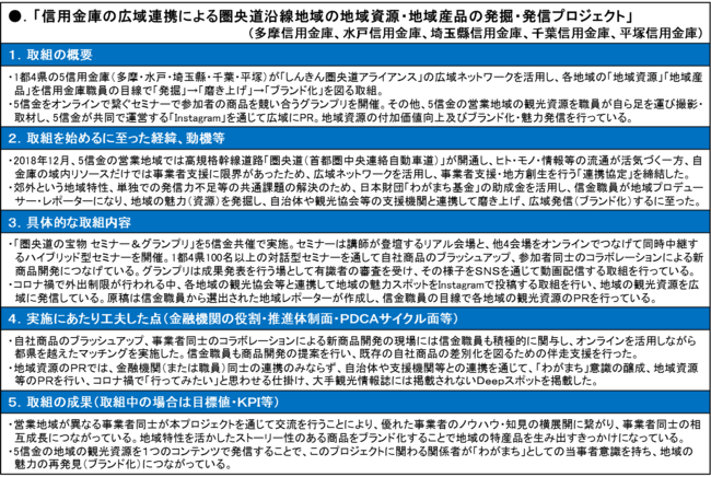 圏央道沿線に本・支店を置く5つの信用金庫が、地域を横断した信用金庫の新たなネットワークを構築することにより圏央道沿線等の地域活性化や観光資源の活用など、地域貢献・地域創生を通じて地域経済の発展につなげることを目的とした協定です。