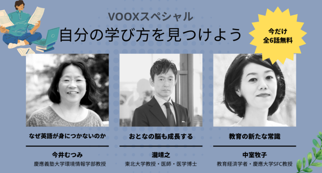 VOOXは、Moon Creative Lab(以下:Moon)が運営する、学びに特化した音声メディアです。1話10分、6話完結のコンテンツ構成で、現在400話以上の第一人者たちの実践知と人々を鼓舞する生の声をお届けしております。本日9月8日(木)、今週リリースしたコンテンツ『学校では教わらない外国語の覚え方』の公開に合わせて、効果的な学び方を紹介した3作品(話し手:今井むつみさん、瀧靖之さん、中室牧子さん)を無料公開しました。