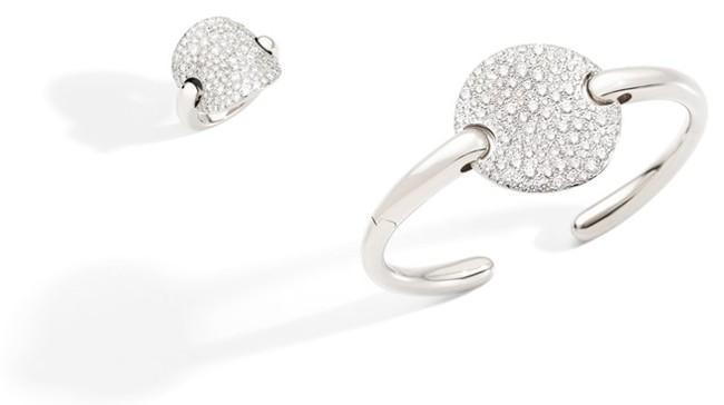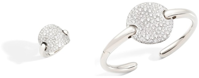 ホワイトダイヤモンドがあしらわれた新作のホワイトゴールドピースには、マンガンゴールドが採用されています。より明るい風合いのこの新しいゴールドは、リングとブレスレットの曲線的なフォルムが指・腕を包み込み、ゆったりとした丸みは肌に優しくフィットします。ポメラートジュエリーならではのもう一つの特徴は、その汎用性です。ディスクシェイプのペンダントをつけられる「ゴールド」ネックレスは、シングルチェーンとしてもラリアットとしても着用できます。洗練されたデザインコードにより、新作は一点ではもちろん、他の「サッビア」ジュエリーとのコーディネートも気軽に楽しめます。