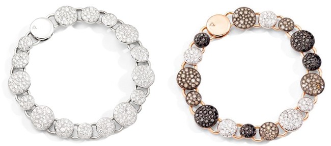 最後にご紹介するのは、ハイエンドブレスレット二点です。手首にしなやかにフィットするブレスレットには、大きさの異なるダイヤモンドをあしらった10以上のディスクがセッティングされています。ホワイトゴールドにはホワイトダイヤモンドを、ローズゴールドにはホワイト、ブラウン、ブラックダイヤモンドの3色をあしらった2種からお選びいただけます。