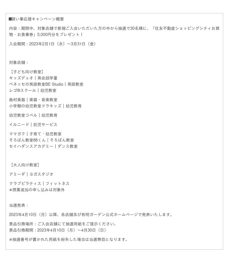 住友不動産商業マネジメント株式会社(本社:東京都新宿区 取締役社長:山本 直人)が、運営する複合商業施設「住友不動産 ショッピングシティ 有明ガーデン」(所在:東京都江東区)において実施する、習い事新規入会キャンペーンについてお知らせいたします。