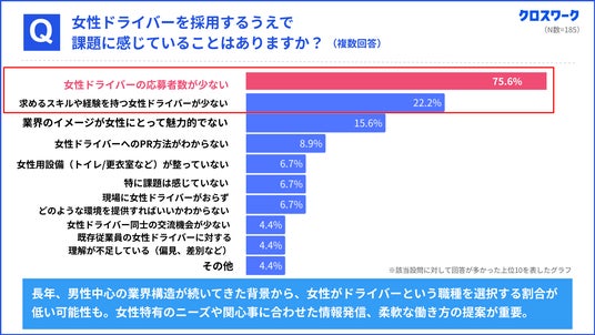 一方、採用における課題も明確になり、「女性ドライバーの応募者数の少なさ(75.6%)」、「求めるスキル・経験を持つ女性の少なさ(22.2%)」など、絶対的な人材不足と、要件を満たす人材の確保難が浮き彫りになりました。