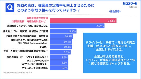 一方、企業の定着策の上位は「柔軟な働き方(34.1%)」「休憩室等の設備整備(12.4%)」「公平な評価(10.8%)」がランクイン。