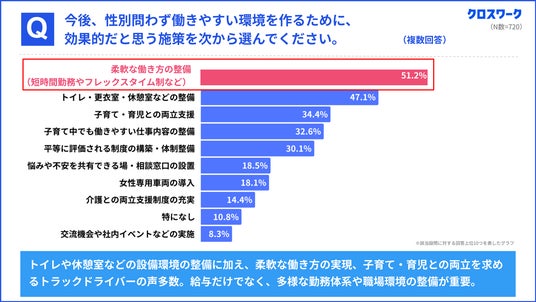 こうした状況を踏まえ、トラックドライバーに男女問わず働きやすい環境を作るための効果的な施策を尋ねたところ、半数以上が「柔軟な働き方の整備(51.2%)」と回答しました。