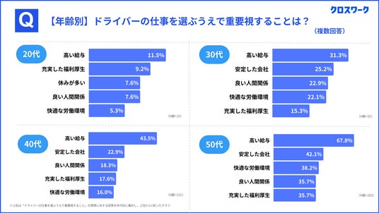 年代別では、全年代で「高い給与」が最重要視され、トラックドライバーにとって収入が仕事選びの根幹であることが改めて明確になりました。また、「充実した福利厚生」も多くの年代で上位にランクインし、経済的安定と長期就労へのニーズが示唆されます。