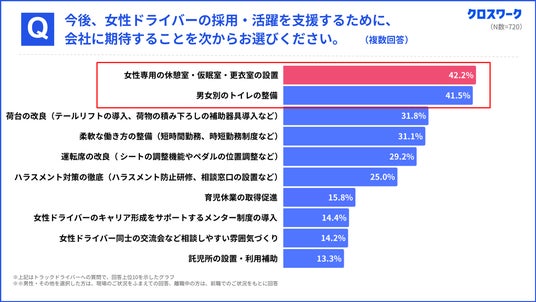 その中で、トラックドライバーに女性ドライバーの採用において会社に期待することを聞くと、上位2つは「女性専用の休憩室・仮眠室・更衣室の設置(42.2%)」「男女別のトイレの整備(41.5%)」となりました。