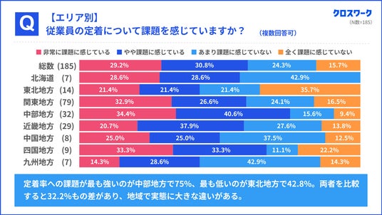 地域別でみると、定着率への課題が最も強いのが中部地方(75.0%)という結果になりました。