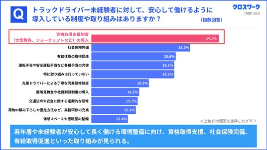 - 未経験者への支援施策トップは「資格取得支援制度(大型免許、フォークリフトなど)の導入(34.1%)」