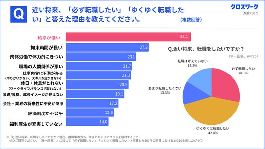 - 一方、転職検討中のトラックドライバーに聞いた理由ベスト3は「給与が低い(53.1%)」「拘束時間が長い(27.2%)」「肉体労働で体力的にきつい(23.1%)」で、労働環境に対する不満が離職を促進