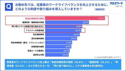 このように多様なニーズにあわせた環境整備が重要視される中、事業者にワークライフバランス向上に向けた取り組みを聞くと「有給休暇取得の推奨(36.8%)」「健康診断・健康相談の実施(28.1%)」「待遇改善(23.2%)」などの声が挙げられました。