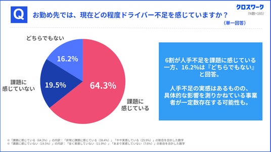 事業者にドライバー不足について質問したところ、6割超が「課題に感じている(*)」と回答した一方、「どちらでもない」の回答が16.2%を占める結果となりました。