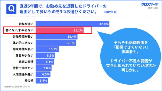 事業者に対して過去5年間のドライバーの退職理由について質問すると、2割が退職理由を「把握できていない」現状が明らかになりました。