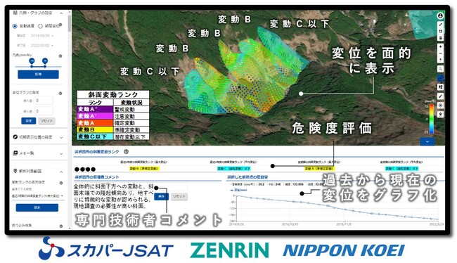 スカパーJSAT株式会社(代表取締役 執行役員社長:米倉 英一)、株式会社ゼンリン(代表取締役社長:高山 善司)、日本工営株式会社(代表取締役社長:新屋 浩明)は、衛星データを用いて、斜面や盛り土等の土構造物、道路や埋め立て地及び周囲のインフラの経年的変状を、ミリメートル精度でモニタリングする法人および自治体向けサービス「LIANA(Land-deformation and Infrastructure ANAlysis)」(商標出願中)をリリースしました。