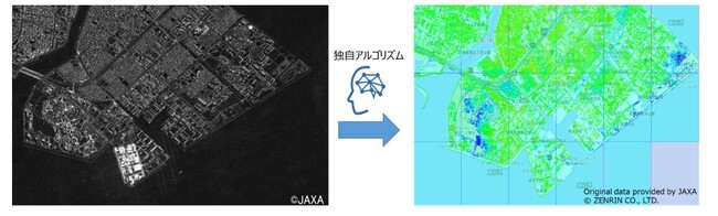 図1:(左)SARにより取得されたデータ(著作権:JAXA )