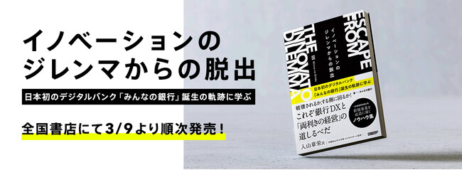 株式会社みんなの銀行(取締役頭取 永吉 健一、以下「みんなの銀行」)は、初の著書『イノベーションのジレンマからの脱出 日本初のデジタルバンク「みんなの銀行」誕生の軌跡に学ぶ』を、全国書店にて2023年3月9日より順次発売スタートすることを、記念日制定した本日「みん(3)な(7)の銀行の日」に合わせて発表します。