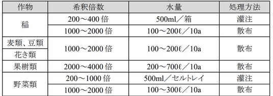 散布で使用する場合は、10aあたり本製品使用量が100~200mlとなるよう希釈液を調製し使用すること