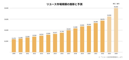 「リユース経済新聞」によると2025年のリユース市場規模は3兆円を超すというデータがございます。