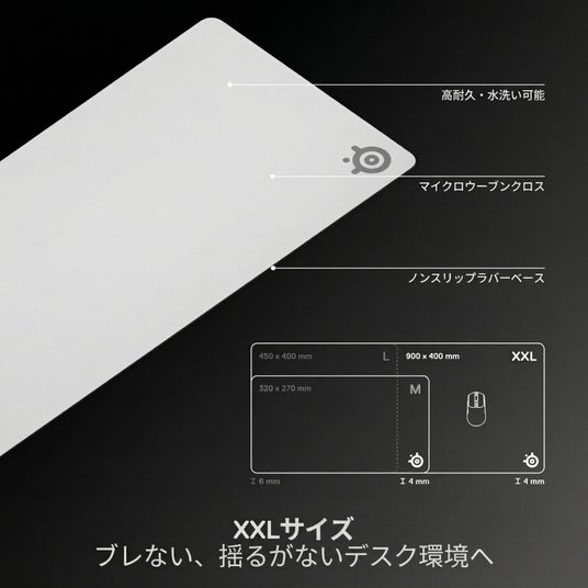 Lサイズは厚さ6mm、XXLサイズは厚さ4mmのため、より一層高い安定感を実感します。また、背面はノンスリップラバーベースを採用することでしっかりと固定されて激しいマウス操作中でも動きません。