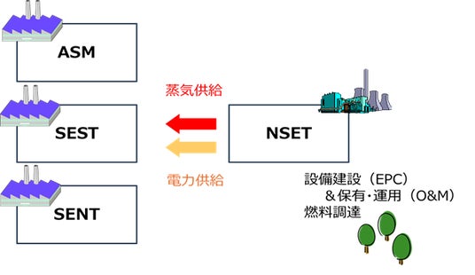 本事業は、NSETが本設備(発電量平均5.0MW、蒸気供給量平均40t/h)をSEST敷地内に設置し、タイ国内で産出された木質チップ※2を燃料として製造した再生可能エネルギー(電力・蒸気)を、SEST・ASM・SENTの3社に供給するものです。NSETが本設備の設置、保有、燃料調達、操業管理、メンテナンスまでワンストップサービスで提供する※3ため、お客さまは本設備にかかる初期投資や設備の操業・メンテナンスの手間をかけることなく安定した再生可能エネルギーの供給を受けることができます。