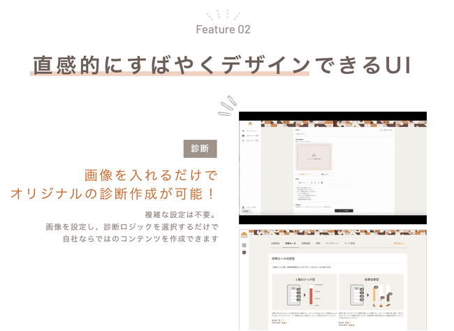 例えば診断アプリであれば、「診断ロジックの選択」を行い、設問・回答の内容をフォーマットに沿って決めるだけで、複雑な設定をすることなく、自社ならではのコンテンツが完成いたします。