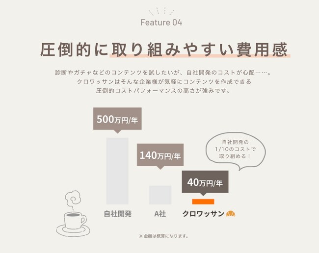 自社開発では、年間約500万円、また他社様のサービスでは年間140万円といった事例もございます。一方、クロワッサンは年間費用は約40万円ほど。月額3万円から可能です。