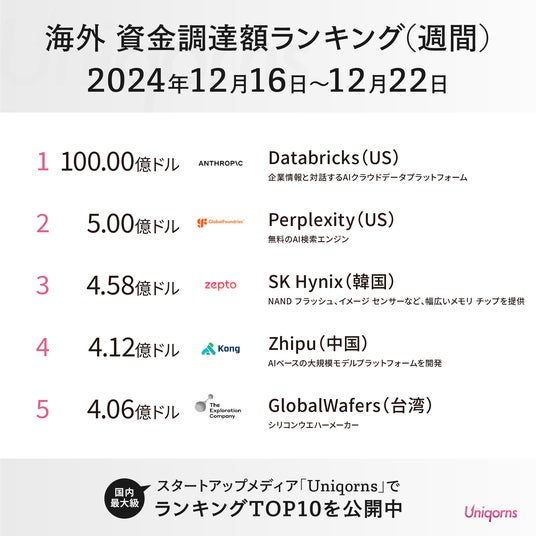国内最大級のスタートアップメディア「Uniqorns(ユニコーンズ)」が海外2024年12月16日~12月22日のスタートアップ資金調達状況をランキング形式で発表