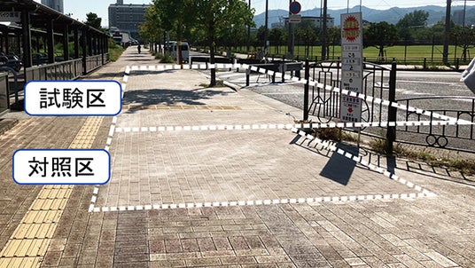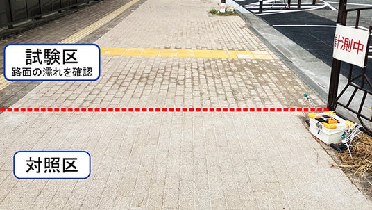 実証試験ではハイドロペイブを施工した部分(試験区)と従来の路盤構造(対照区)を施工し、歩道部(湿潤舗装)における路面温度と、車道部(透水性舗装)における雨水の浸透状況について比較検証しました。