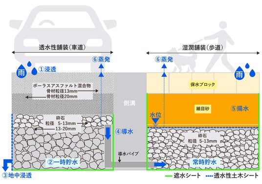 ハイドロペイブは、車道部の透水性舗装と歩道部の湿潤舗装を組み合わせた舗装です。透水性舗装は、ポーラスアスファルト混合物(またはポーラスコンクリート)(※3)と砕石で構成され、湿潤舗装は保水性ブロックと細目砂と砕石で構成されており、2つの舗装は、地中で導水パイプにより結合しています。
