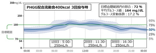 - 糖尿病患者では、PHGG配合流動食1日3回投与法よりも2回投与法の方が、目標血糖範囲内の時間の割合は増加し、平均グルコース値も低下しました。