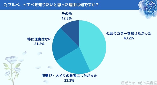 ブルベ、イエベを知りたいと思った理由をお聞きしたところ「似合うカラーを知りたかった(43.2%)」、「服選び・メイクの参考にしたかった(23.3%)」、「特に理由はない(21.2%)」、「その他(12.3%)」という結果になりました。